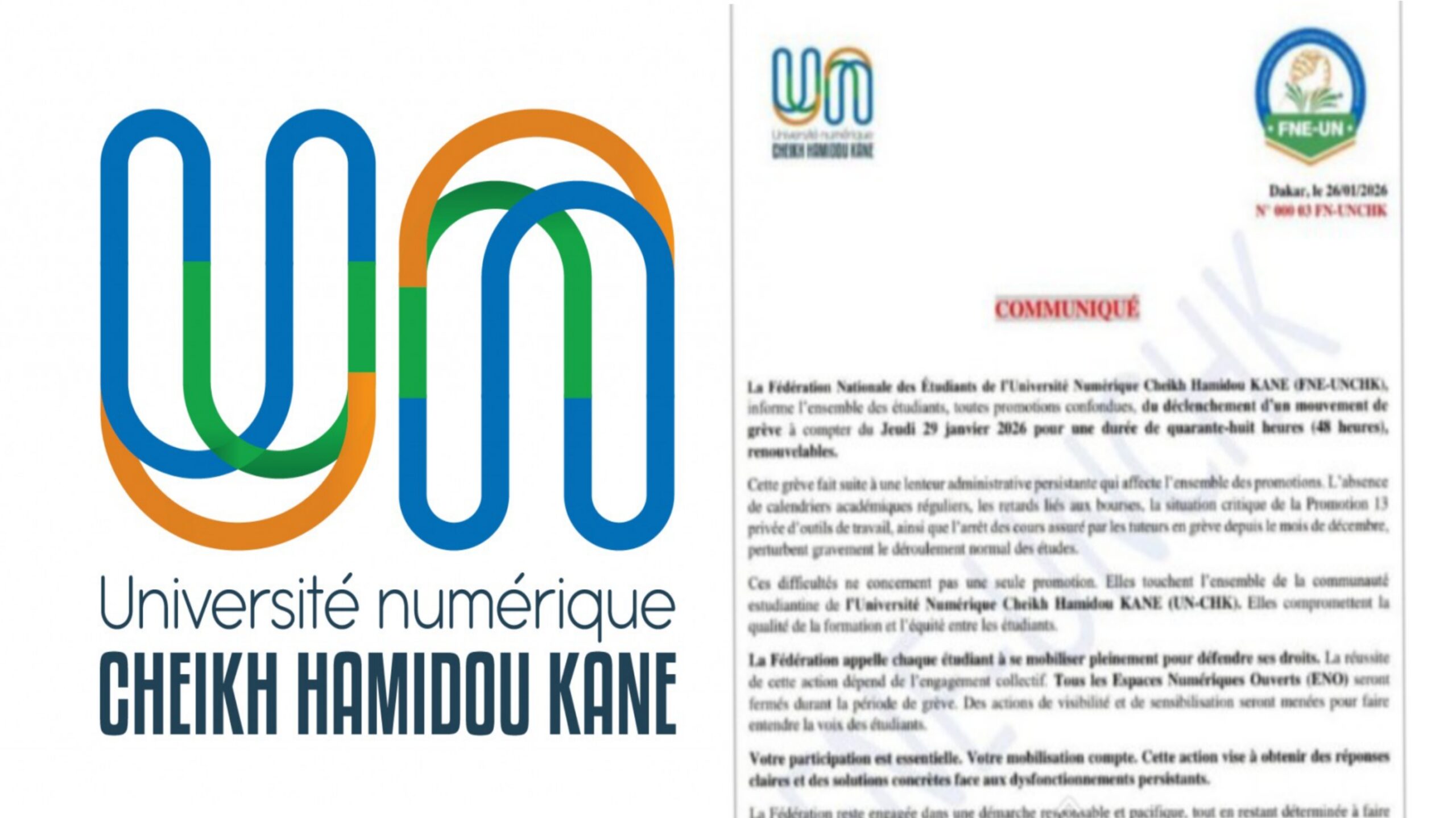 Kaolack infos le 27 Janvier 2026 . La Fédération nationale des étudiants de l’Université Numérique Cheikh Hamidou Kane (FNE-UNCHK) a annoncé le déclenchement d’un mot d’ordre de grève de 48 heures, renouvelable à partir du 29 Janvier , au sein de ladite université.